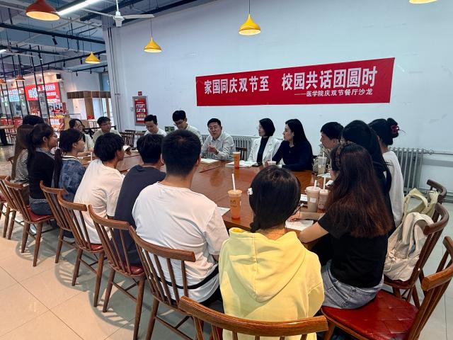 金秋送爽,丹桂飘香,在中秋与国庆双节来临之际,9月29日下午,医学院于翰苑餐厅举办“家国同庆双节至,校园共话团圆时”庆双节活动,医学院党委副书记、副院长王炜明,医学院辅导员,2024级新生班助及2025级新生代表参与此次活动,师生欢聚一堂,共话团圆,共畅未来。