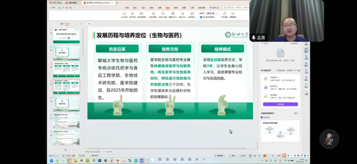 孟震围绕医学院研究生培养工作展开介绍,详细讲解了生物学、生物与医药专业的发展历程与培养定位。随后,孟震深入阐述了医学院高层次应用型人才培养目标,对于生物学与生物与医药专业,着重培养学生良好学术素养和学术道德,使其具备严谨的科学精神、独立的思考和动手能力,能利用生物学知识解决基础医学或科学问题,毕业生可在医疗机构、生物科技公司、生物制药公司等从事相关基础研究和临床转化研究工作。同时,孟震老师还展示了学院强大的导师队伍与科研实力。学院现有导师17人,其中教授8人、副教授4人,泰山学者等省级人才工程5人。近五年,导师团队承担课题40余项,出版著作3部,发表论文200余篇,获科技奖项10余项。