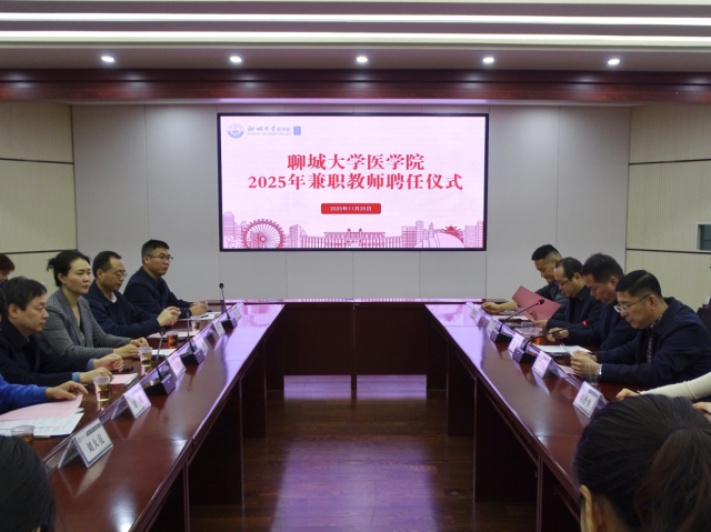为汇聚临床与实践精英,共育卓越医学人才,11月25日下午,医学院于东校区晨晖楼二楼团委会议室举行2025年兼职教师聘任仪式。聊城市人民医院教育培训部主任夏春鹏,聊城市眼科医院党委委员、纪委书记楚媛,聊城市人民医院口腔医学部主任刘琨,聊城市人民医院首席专家张传臣,聊城市人民医院影像中心主任刘大亮,东昌府区妇幼保健院嘉明院区副院长、科教科主任张磊等合作单位领导与专家应邀出席。医学院党委书记明辉,党委副书记、副院长王炜明及兼职教师代表和医学院各教研室负责人出席仪式,仪式由医学院副院长孟震主持。