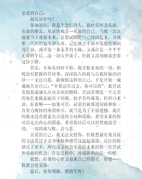 活动过程中,同学们以热忱为笔、以初心为墨,用情感和想象力创作出承载着记忆的作品,记录下他们人生中的某一时刻,以此为媒,向未来传递思绪,让这些记忆转化为前行的动力。这些作品不再是冰冷的纸张,而是承载着青春温度的时光载体,是串联起成长轨迹的情感纽带,精准定格了人生旅途中那些值得铭记的珍贵时刻,诠释了“直面困惑、向阳生长”的成长真谛。在创作与分享的过程中,同学们收获了与自我对话的清醒,在回望中明晰初心与方向,亦坚定了逐梦前行的笃定,在交流中汲取奋进的力量。这与同学们不甘平庸、敢闯敢拼的青春底色不谋而合,也让活动的意义远超创作本身。这些凝聚着情感与思考的作品,终将成为同学们青春路上最珍贵的财富,激励着同学们在未来的人生旅程中,始终保持向阳而生的姿态,勇敢奔赴每一场山海。