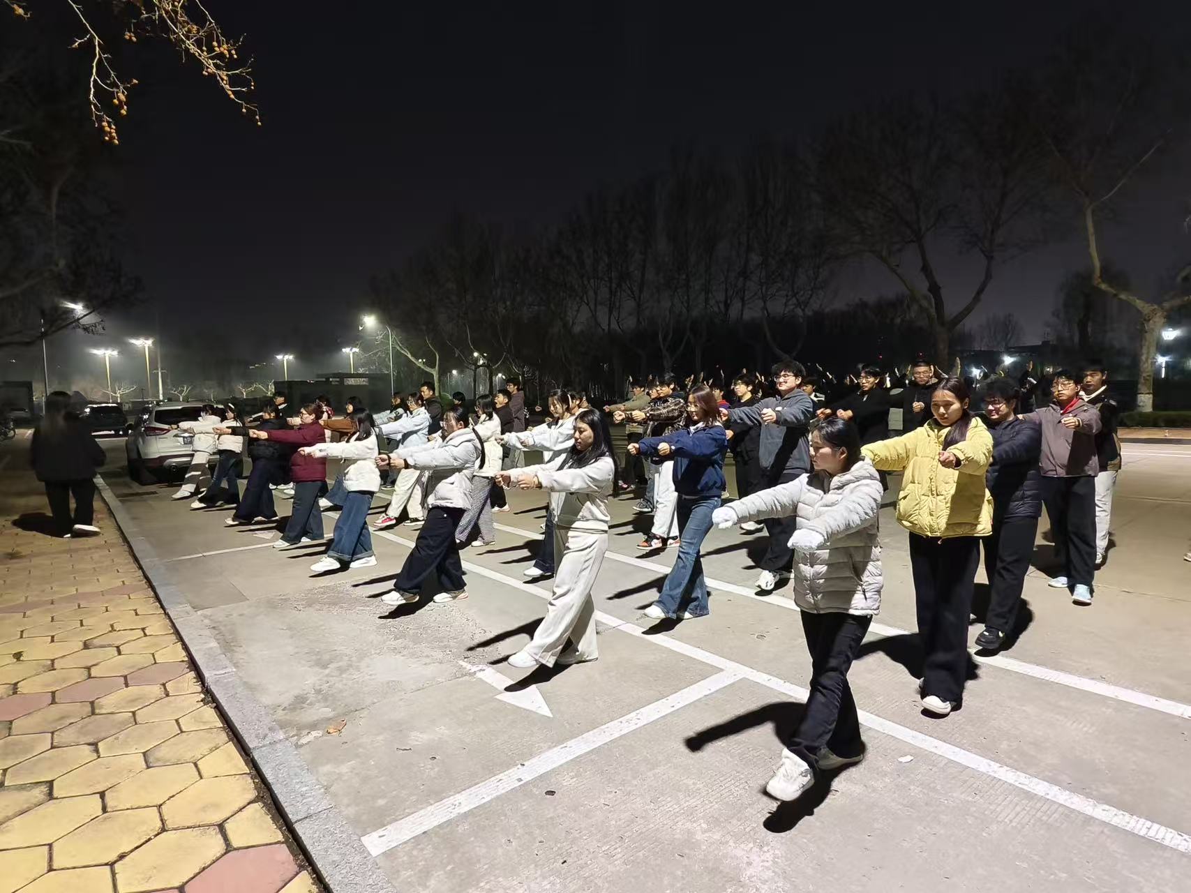 傍晚的世纪广场,晚风轻拂,暮色渐浓,同学们的热情却丝毫未减,早已整齐列队集结于此。在领操同学与负责人的带领下,同学们伴着明快的节奏认真练习、反复打磨每一个动作细节:伸展运动舒展大方,扩胸运动刚劲有力,踢腿运动规范到位……一招一式间都凝聚着专注与汗水。从手臂扬起的高度、步伐迈动的幅度,到转身的角度、停顿的姿态,甚至指尖的摆放与眼神的配合,同学们都逐一规范、力求标准,在一遍遍整齐划一的训练中,不断提高动作熟练度与团队协作默契度。暮色与灯光交辉,同学们身姿昂扬、动作整齐,构成了校园里一道朝气蓬勃的靓丽风景线。随着训练的持续推进,同学们的动作愈发标准,每个人眼中都闪烁着为集体荣誉拼搏的坚定光芒,为即将到来的比赛做好了充分准备。
